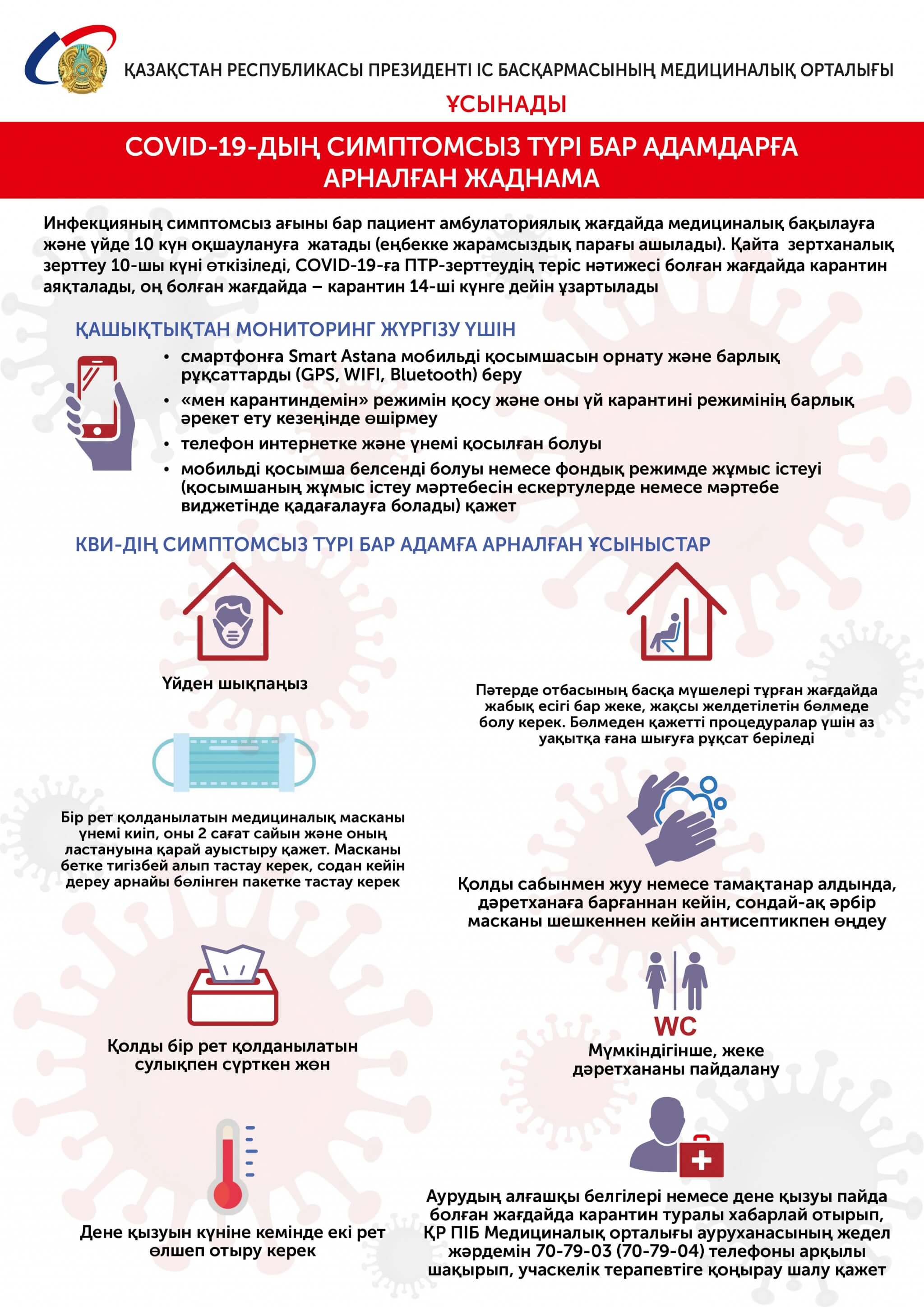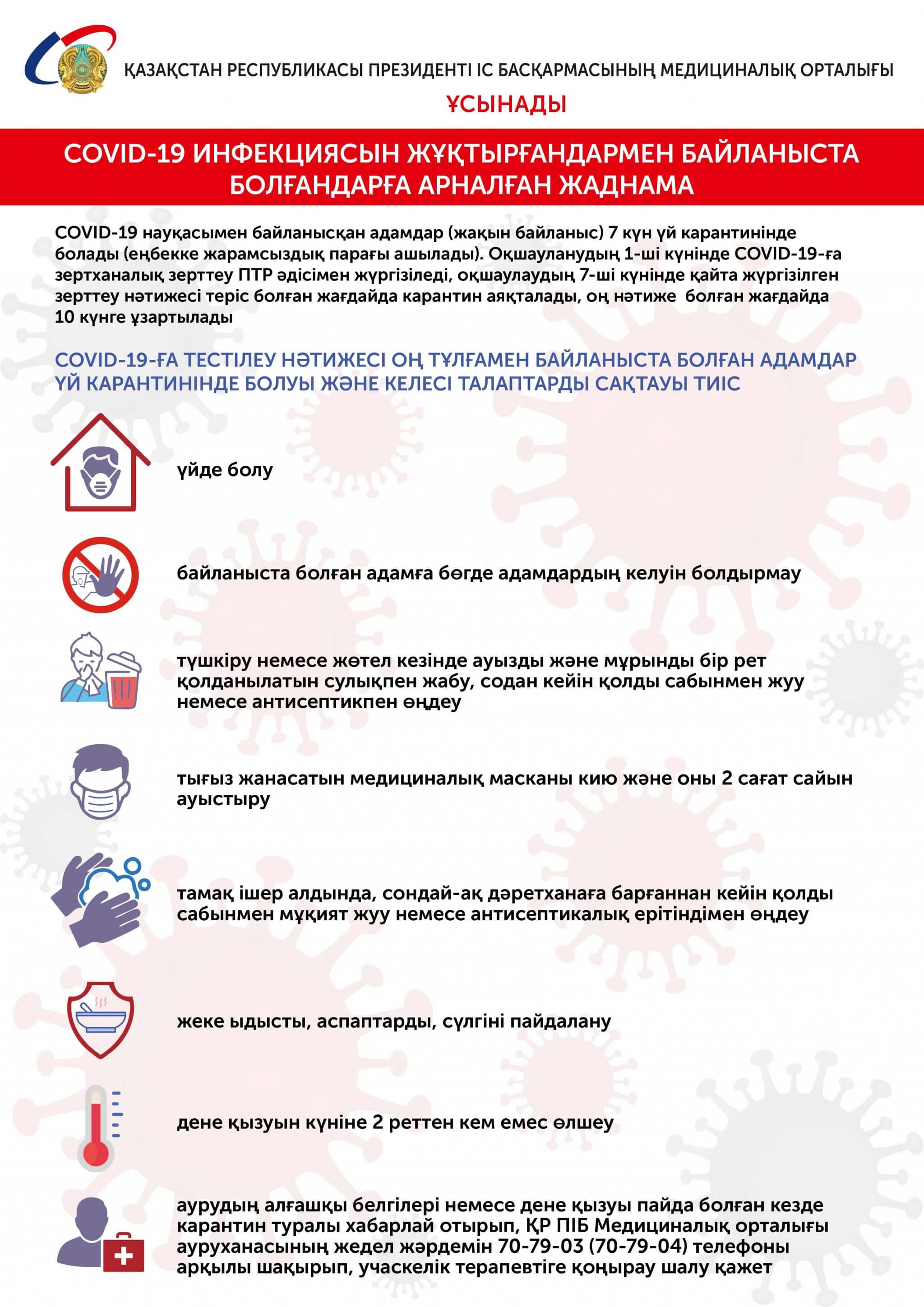 Пандемия жағдайында инфекцияның таралуына және елдегі эпидемиологиялық жағдайдың нашарлауына жол бермеу – әрбір адамның әлеуметтік жауапкершілігі. Симптомдары айқын көрінетін инфекция жұқтырған адамдардан басқа, аурудың ағымы симптомсыз өтіп жатқан, коронавируспен ауыратын науқастармен байланыста болған адамдар да бар. Біз Өздеріңізбен екі жағдайға да қатысты қазақ және орыс тілдерінде әзірленген жаднамамен бөлісеміз. Өзіңізге сақтап алып, жақындарыңызбен бөлісіңіз!
